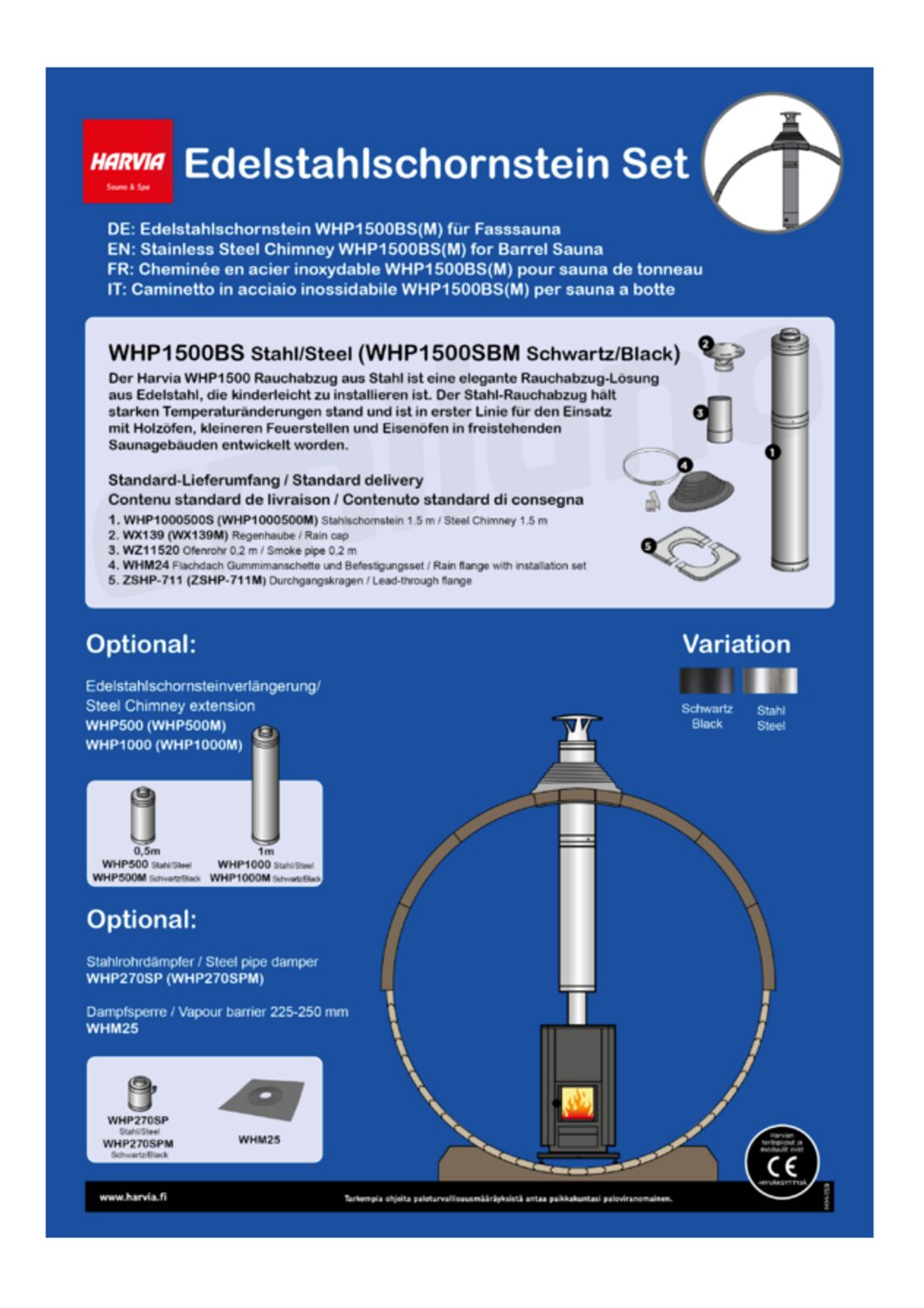 1x Harvia Edelstahlschornstein 1500 für Fasssauna Set mit Zubehörsatz