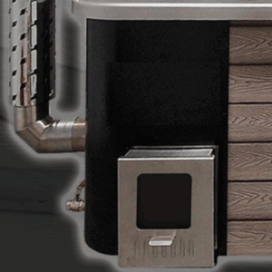 Holzofen integriert – 30 kW: hohe Bauform, etwas mehr Leistung, nimmt keinen Platz in der Wanne, da ergonomisch geformt.